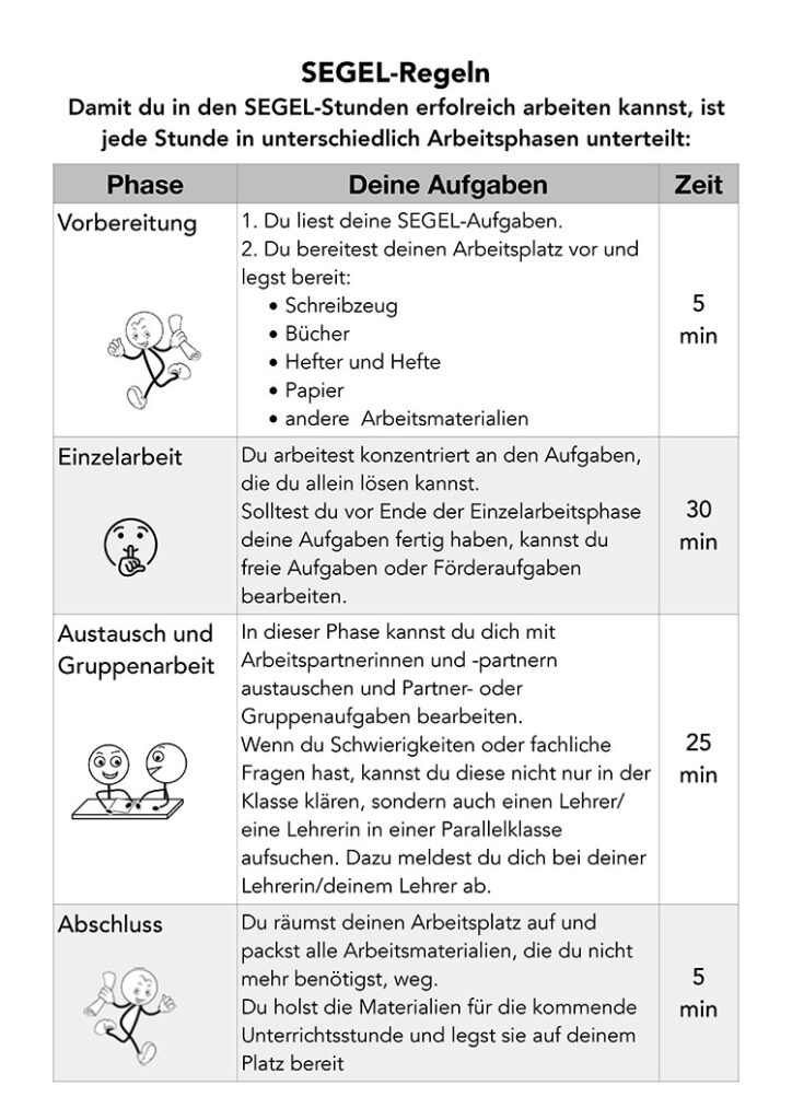 An unserer Schule kannst du in den SEGEL-Stunden Aufgaben bearbeiten. Diese Aufgaben musst du nicht zuhause machen. Du kannst dir deine SEGEL-Stunden selbst einteilen. Auch dafür gibt es Regeln: