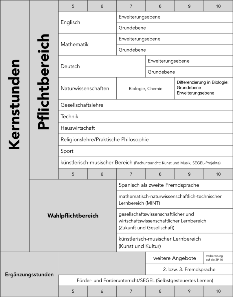 Die Nelson-Mandela-Schule ist eine integrierte Sekundarschule von Jahrgang 5 bis Jahrgang 10. Das bedeutet, dass alle Schülerinnen und Schüler von Klasse 5 bis zu ihrem Schulabschluss in Klasse 10 im Klassenverband mit innerer Differenzierung auf Grund- und Erweiterungskursniveau in Mathematik und Englisch ab Klasse 7, in Deutsch ab Klasse 8 und in Physik/ Chemie ab Klasse 9 unterrichtet werden. Die Schülerinnen und Schüler gehen von Klasse 5 bis 9 in die nächste Jahrgangsstufe über. Nur die Versetzung in Klasse 10 erfordert den Abschluss nach Klasse 9. Unterrichtet wird nach den Lehrplänen der Gesamtschule. In der 6. Klasse setzt das 4. Hauptfach ein. Dieses Wahlpficht-/ Neigungsdifferenzierungsangebot (WP I) ist breit gefächert. Folgende Bereiche stehen den Kindern zur Wahl:
